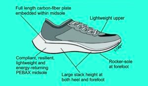 The term “super shoes” refers to footwear with stiff plating made from carbon fibers, combined with lightweight foam designed to propel the user and provide a “bouncy” ride. Super shoes supposedly increase running economy by providing a lever to propel the heel up and the foot forward.